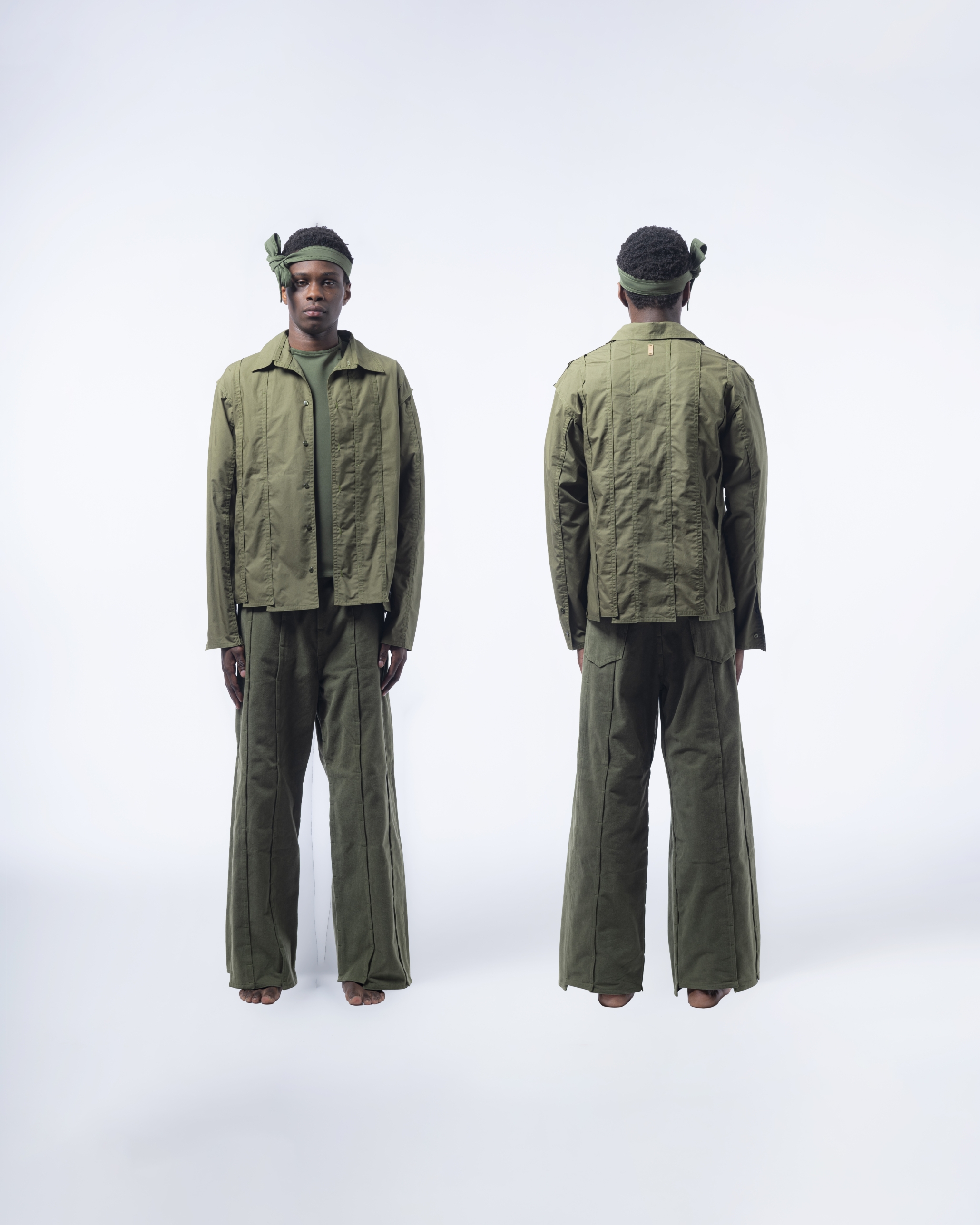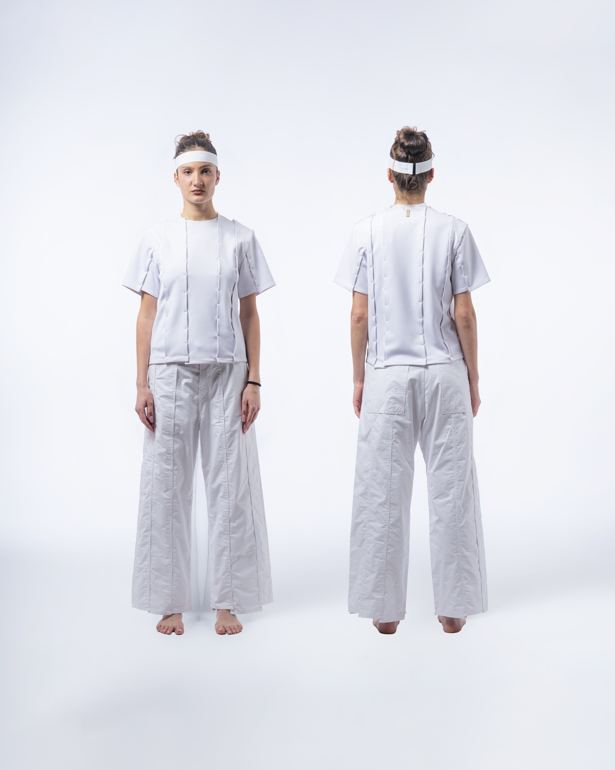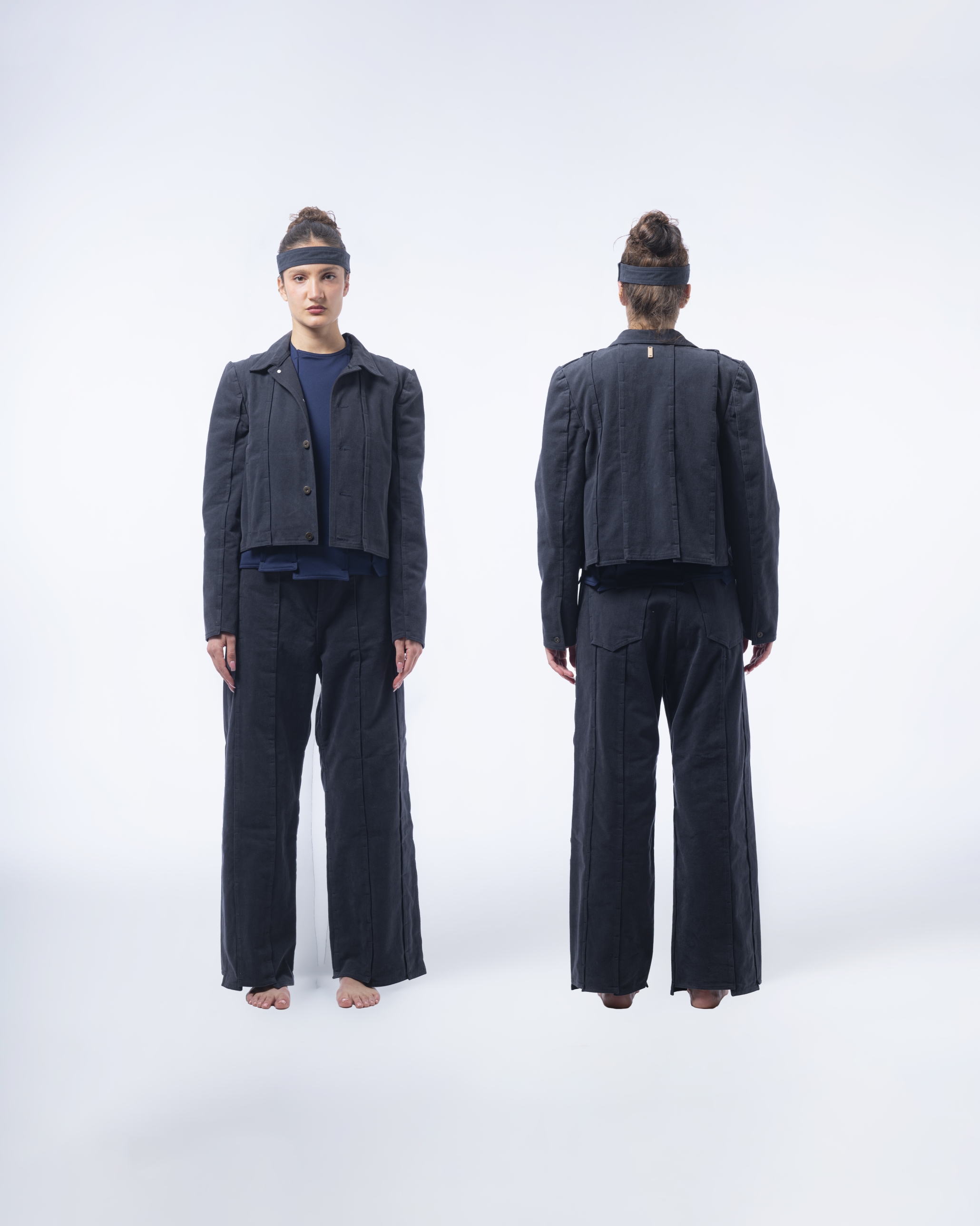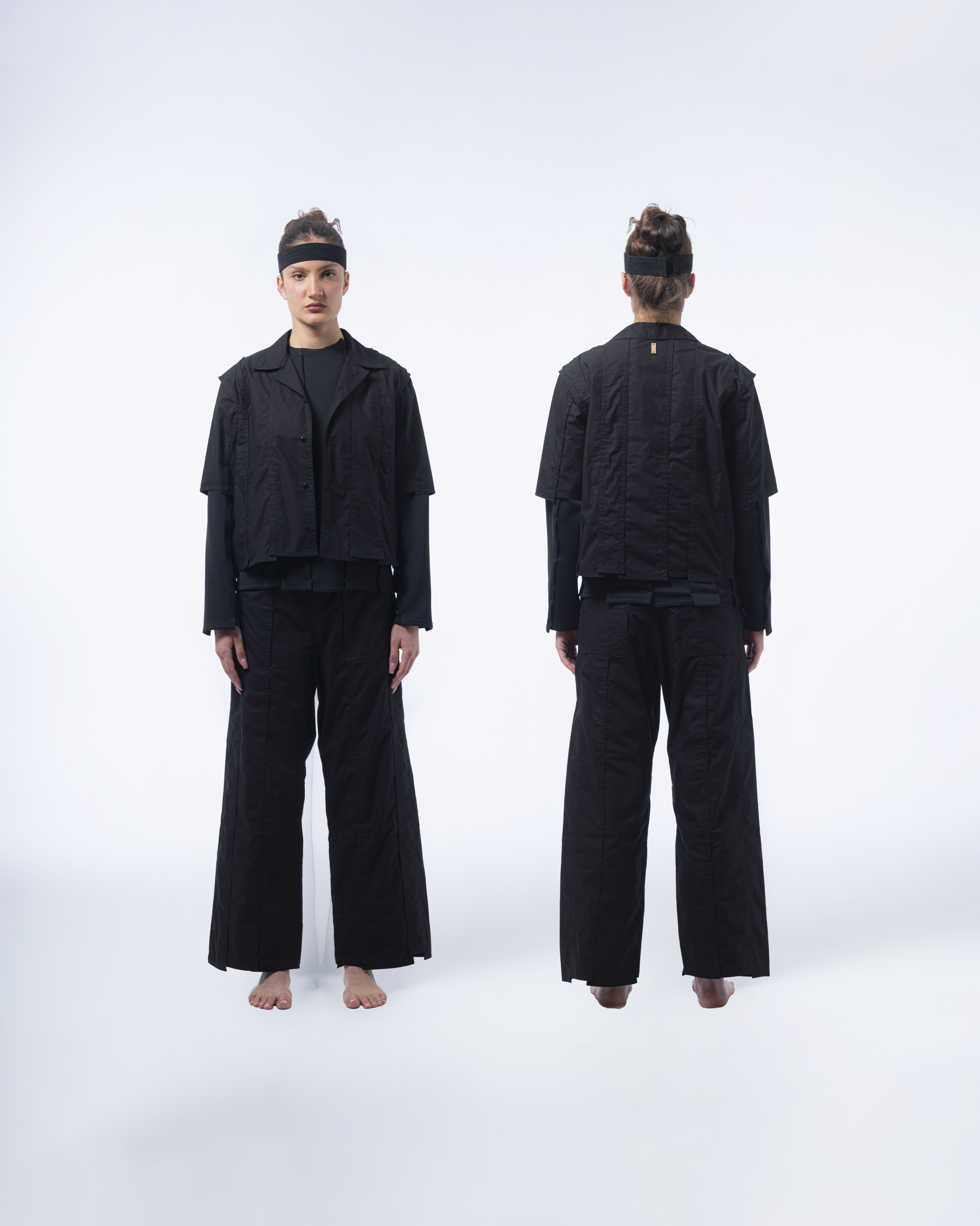 -DAESSECA- (DISSECTION) COLLECTION EXPOSES THE BODY AND NATURE OF A GARMENT THROUGH THE USE OF ASYMMETRICAL VERTICALLY CUT FABRIC STRIPES, INDIVIDUALLY CREATED, AND REASSEMBLED BY SUPERPOSITION. THE COLLECTION TAKES INSPIRATION FROM THE DISSECTION OF BEINGS AND HOW, INDIVIDUAL PARTS (PATTERN/ORGANS), MEANINGLESS ON THEIR OWN, BECOME PART OF A COMPLETE BODY (GARMENT/BEING) ONCE ASSEMBLED.